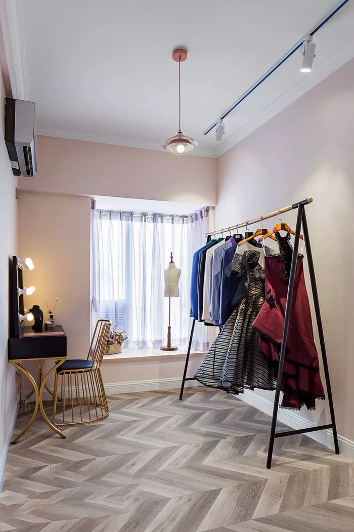 臥室里的衣帽間,有著與玄關衣帽架類似的功能,不過這里的衣帽架可以容納更多的衣物,比如冬天有好幾件外套需要每天更換的,那么也可以方便地掛在上面,不需要每次都到衣柜里去翻找。