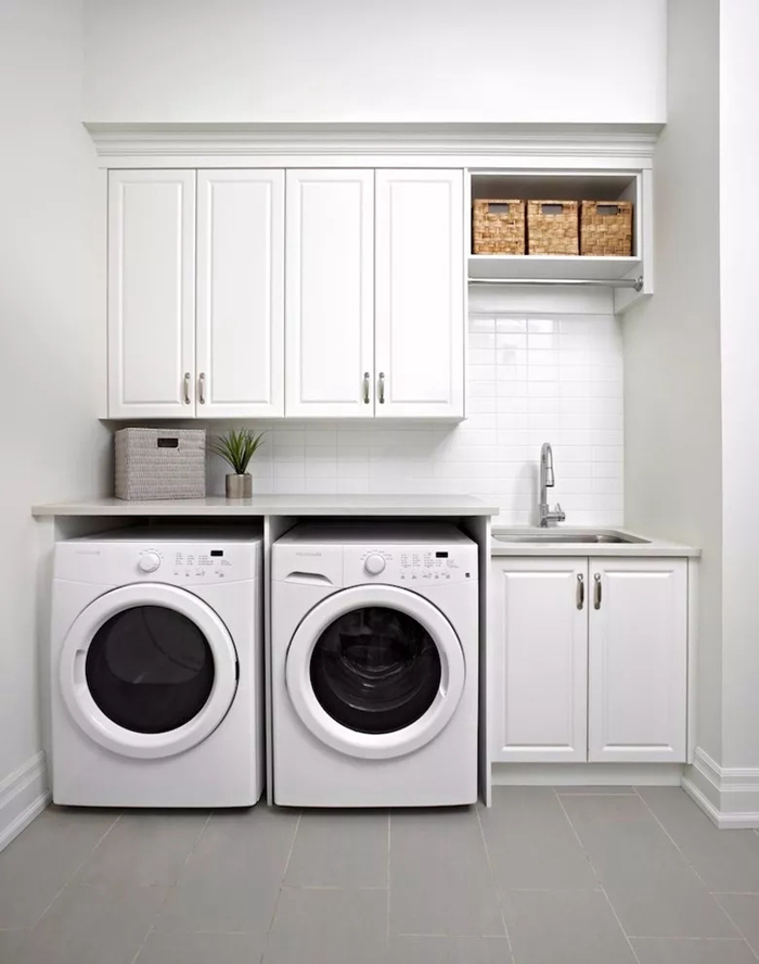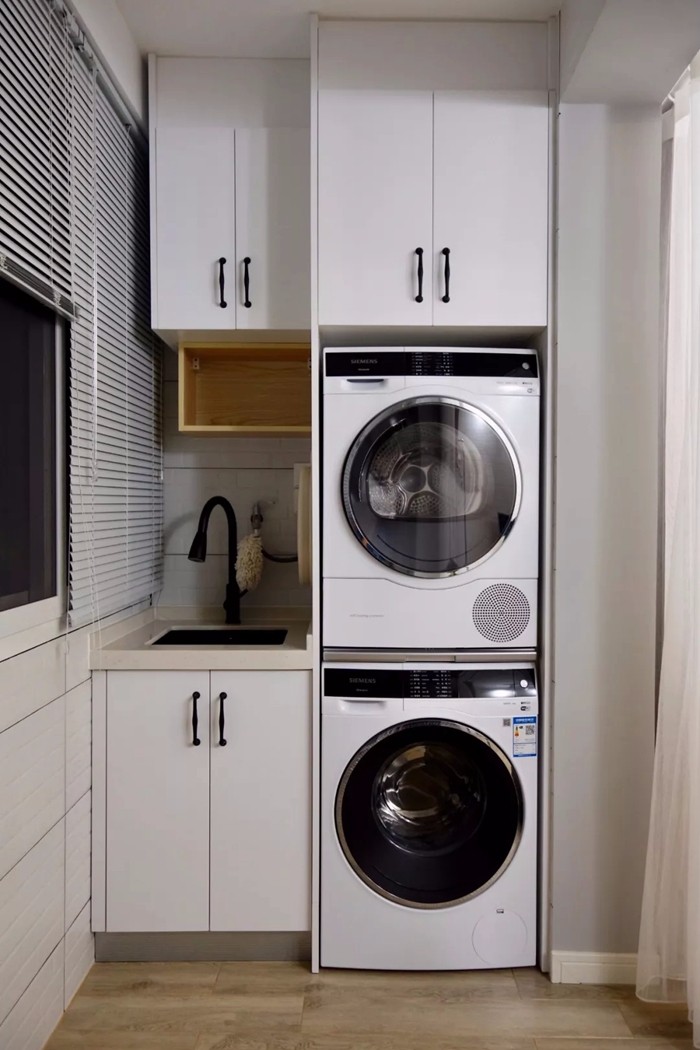 如果空間有限的情況,也可以通過(guò)把洗衣機(jī)與烘干機(jī)疊放在一起,這樣的設(shè)計(jì)非常的節(jié)省空間;但是這種放置方式對(duì)機(jī)器安裝有一定要求,建議先確定好機(jī)器與安裝條件再選擇,而且疊在上方的烘干機(jī)用起來(lái)也會(huì)有點(diǎn)別扭。