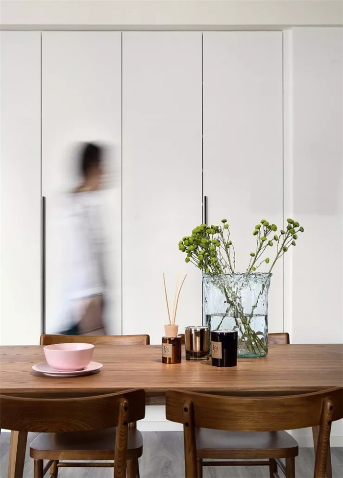 ▲ 餐廳緊緊挨著客廳,花紋塊毯形成了客廳的潛意識邊界線,餐廳區把實木的色彩作為主要色彩,幾乎沒有去想辦法豐富,一個數插畫,一個粉色的碗碟,這就是全部設