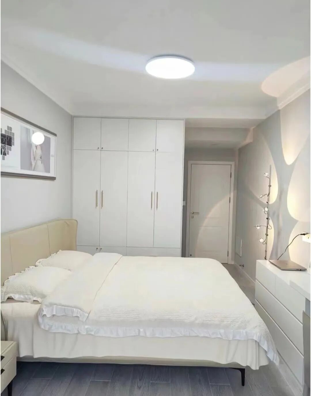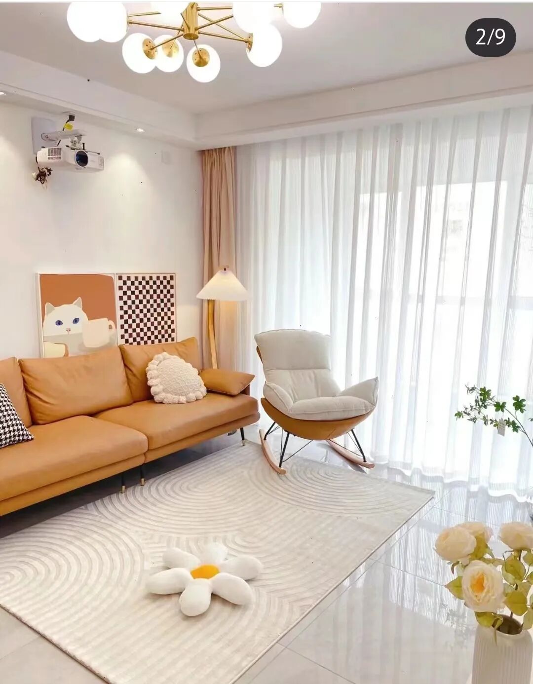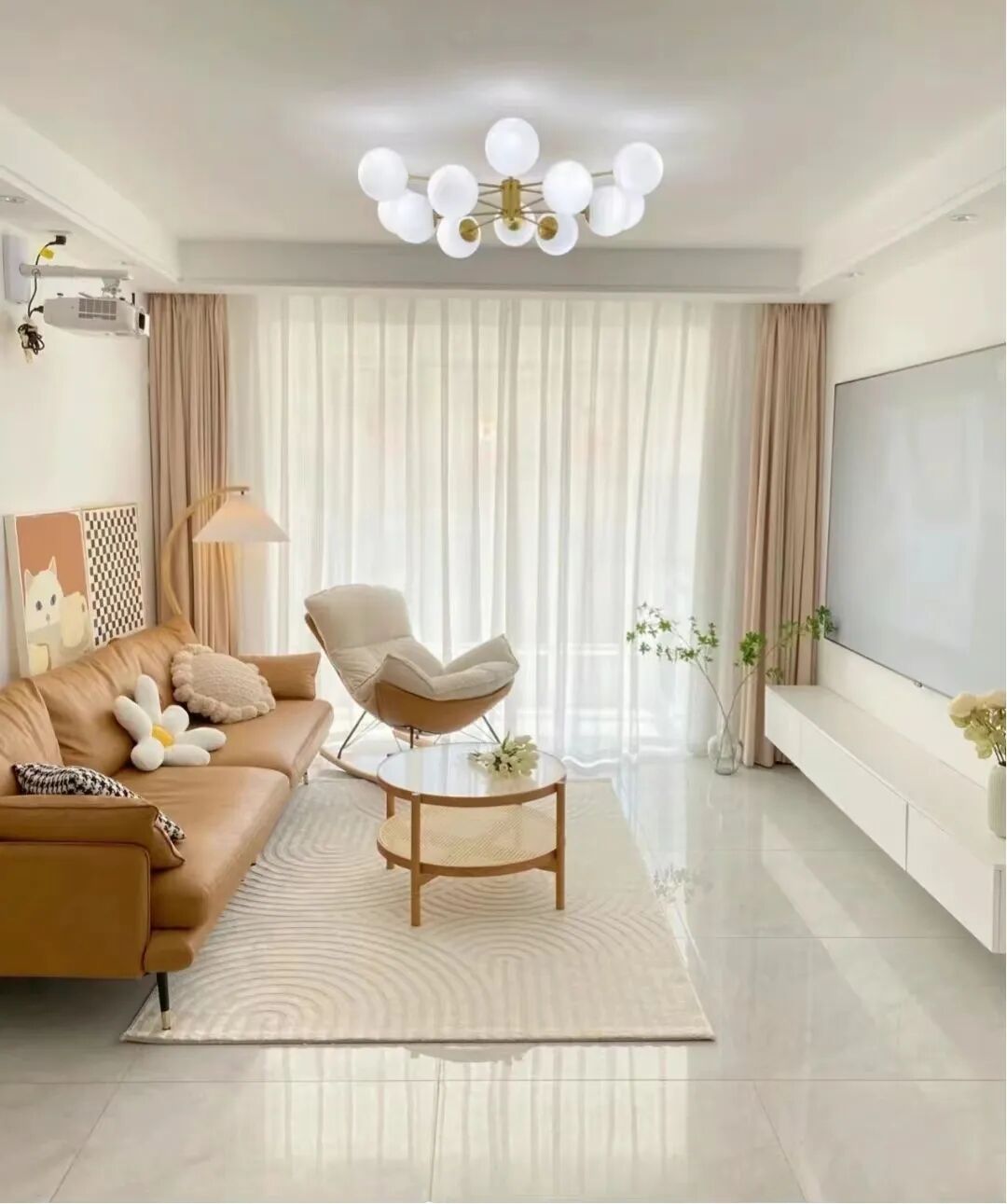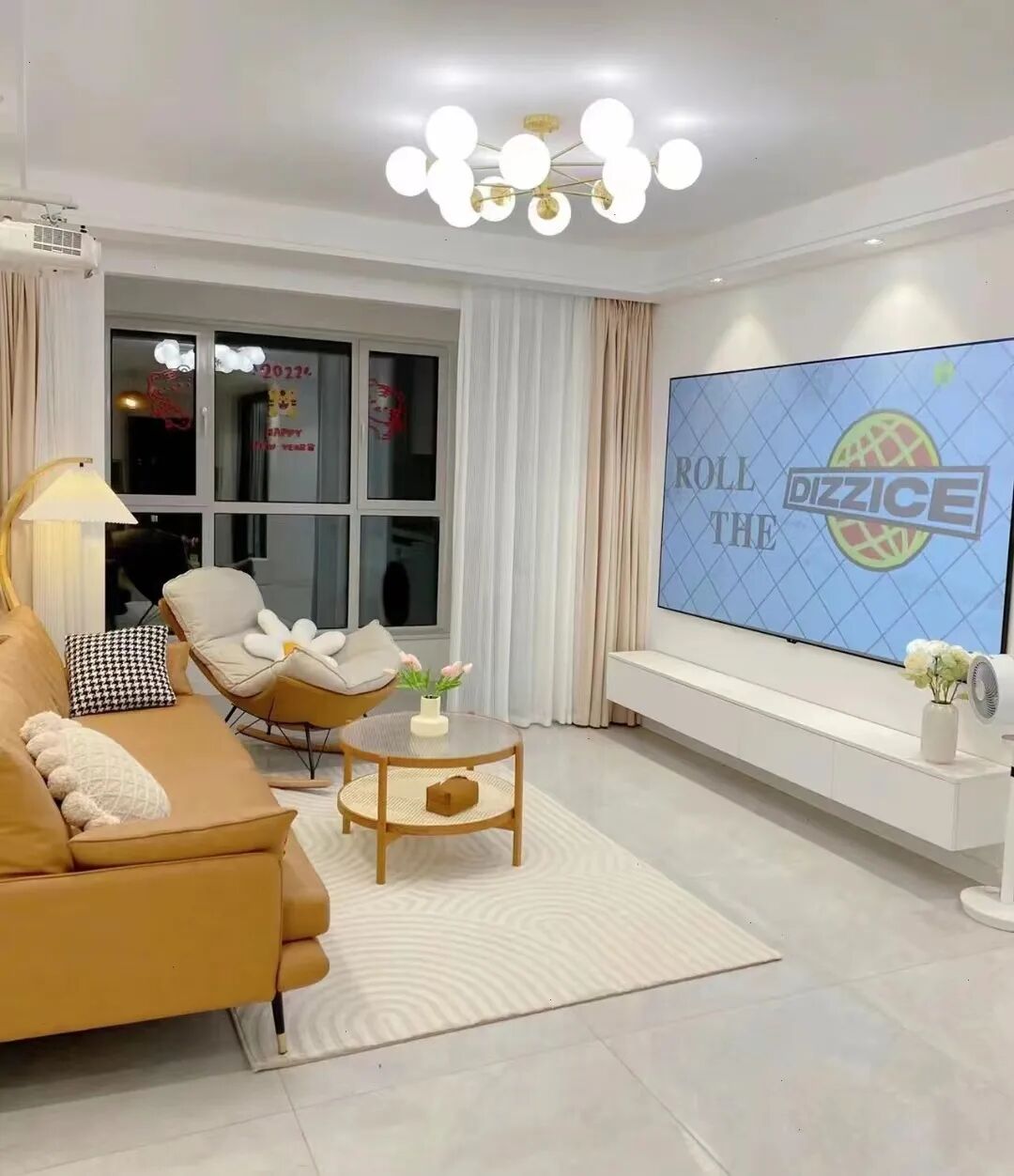 ? 客廳沒有選擇放電視,直接在白色的墻上掛一個幕布用來投影,這樣屏幕大、觀影效果好、氛圍感強。