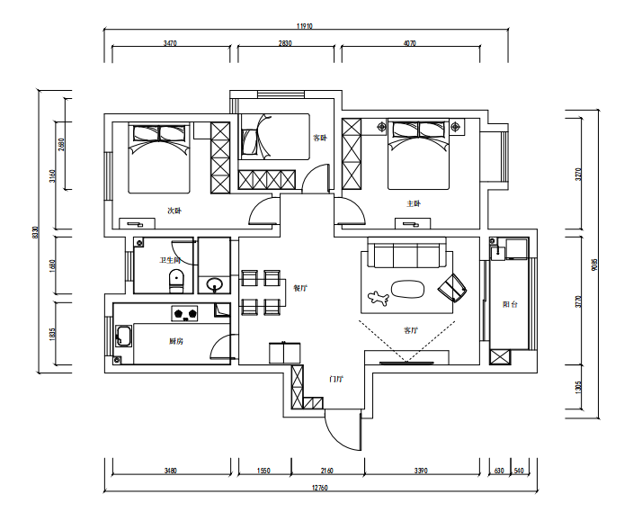 ? 改造是入戶門對著書房的門,把北面房的走道空間給客廳,書房的門與北臥相連。